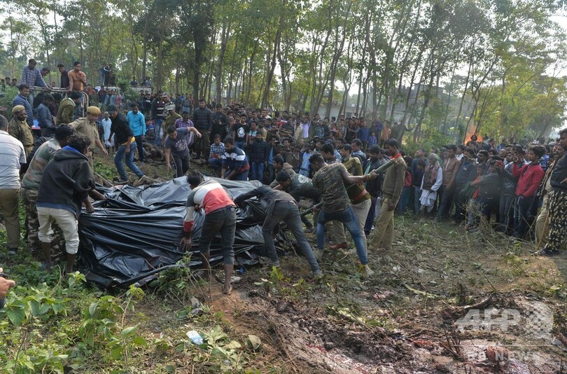 2頭の死骸のそばには地元住民数十人が集まり、祈りをささげる人もいた。周囲に丸太が積み上げられ、火が付けられた。(c)AFP