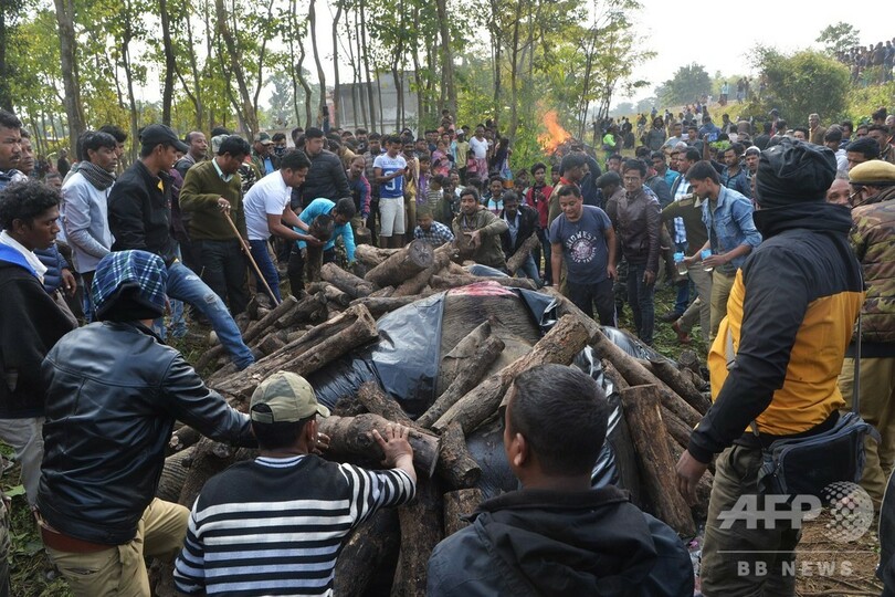 2頭の死骸のそばには地元住民数十人が集まり、祈りをささげる人もいた。周囲に丸太が積み上げられ、火が付けられた。(c)AFP