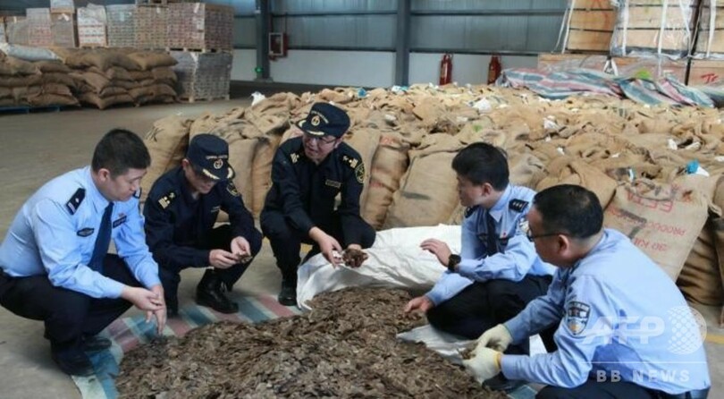 荷主の容疑者らはアフリカのある国からうろこを仕入れ、海外の密輸団に密入境を依頼。10月29日早朝に上海の税関が設置されていない埠頭(ふとう)から荷揚げし、温州までの輸送を委託した物流会社が容疑者らに引き渡す際に摘発された。(c)CNS/JCM/AFPBB News