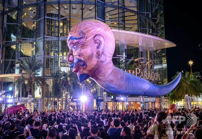 【12月23日 AFP】タイ・バンコクで開催されたクリスマスショーで、見物客の頭上に浮かぶ伝説のキャラクターを表したバルーン。