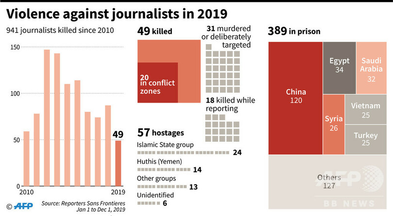 2019年の記者死亡は49人 紛争地で減少も暗殺・収監は増加