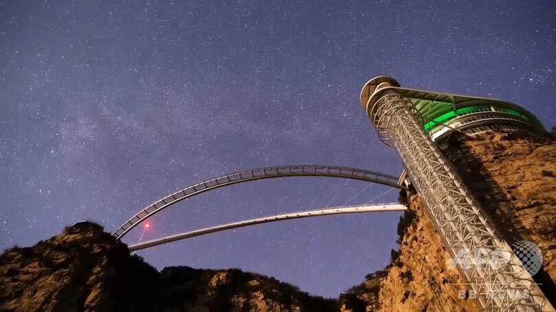 山東省(Shandong)淄博市(Zibo)潭溪山の景勝地にある「潭溪山展望ガラス橋」は、海抜700メートルの断崖絶壁の上にあり、2017年から正式に利用が開始された。世界初の「片持ち梁(はり)」ループ型斜張橋で、虹のような形の橋の下に重さを支える鉄骨はない。長さ117メートル、高さ101メートル、円形桁外側の最大半径は90メートルで、通行可能人数は1万人だ。