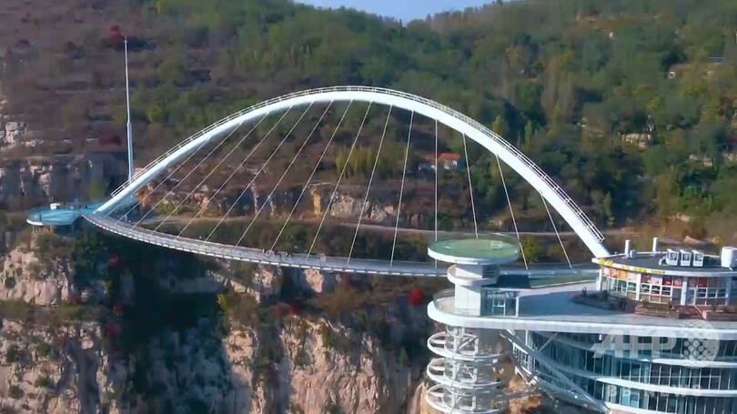山東省(Shandong)淄博市(Zibo)潭溪山の景勝地にある「潭溪山展望ガラス橋」は、海抜700メートルの断崖絶壁の上にあり、2017年から正式に利用が開始された。世界初の「片持ち梁(はり)」ループ型斜張橋で、虹のような形の橋の下に重さを支える鉄骨はない。長さ117メートル、高さ101メートル、円形桁外側の最大半径は90メートルで、通行可能人数は1万人だ。