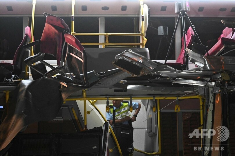 【12月18日 AFP】(更新、写真追加)香港で18日、2階建てバスが木に衝突し、6人が死亡、数十人が負傷した。警察が発表した。