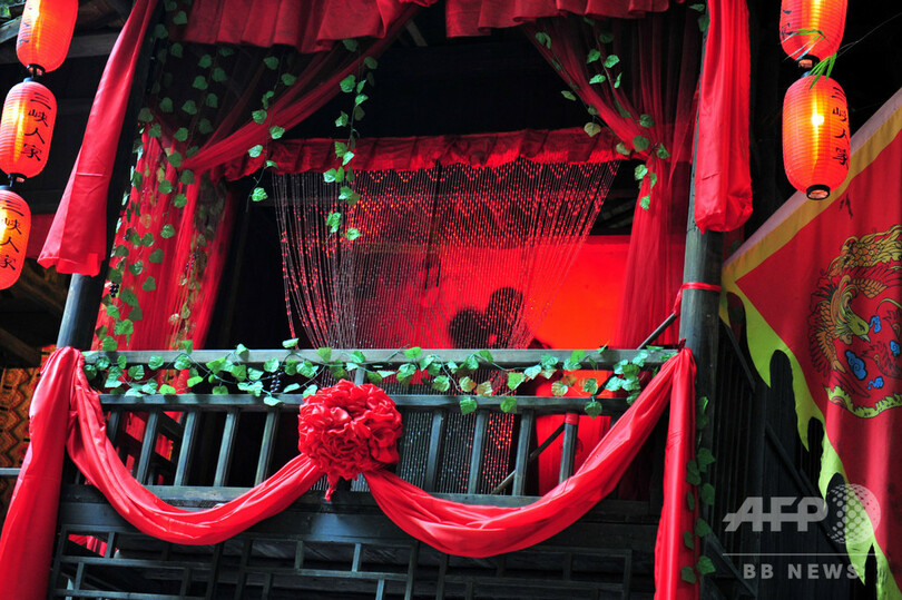 新郎役の男性は、土家族の娘さんから献じられた地元の茶「峡江茶(Xiajiangcha)」を飲み、新郎の衣装に着替え、土家族の雰囲気があふれる中、新婦役の娘さんと固めの酒杯を交わし、娘さんの手を取って新居に導くという喜びのシーンを演じることができる。(c)CNS/JCM/AFPBB News