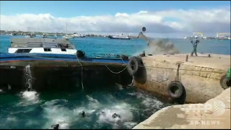 【12月23日 AFP】(写真追加)エクアドルが領有するガラパゴス諸島(Galapagos Islands)で約2200リットルのディーゼル燃料を積んでいたはしけが沈没し、当局は22日、周辺環境への汚染拡大を防止する措置を取った。