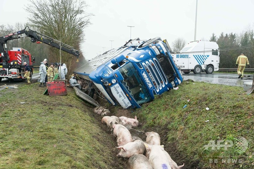 ニュース 社会 トラックが幹線道路で横転、ブタが車外へ ベルギー 2019年12月24日 12:40 発信地:モールベーケ/ベルギー [ ベルギー ヨーロッパ ] このニュースをシェア ‹ › ❮ 1/3 ❯ 横転したトラックから出たブタ。ベルギーのモールベーケにて(2019年12月23日撮影)。(c)JAMES ARTHUR GEKIERE / BELGA / AFP 画像作成中 ! 【12月24日 AFP】ベルギー北部のモールベーケ(Moerbeke)の幹線道路で23日、ブタを搬送していたトラックが横転し、ブタが車外に出る事故が起きた。(c)AFP 社会 一覧へ> メディア・報道関係・法人の方向け 写真・動画 購入のお問合せ>