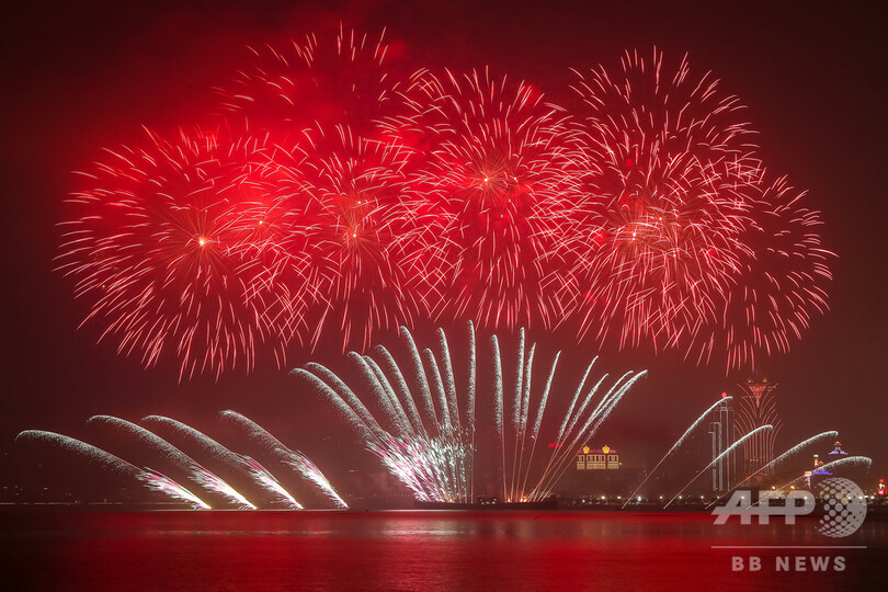 花火の演目は「美しき中国で団らんを祝う」「歳月は歌の如(ごと)くマカオとの約束」「マカオと珠海は一家、親近の情深し」および「互いに助け合い、共に大湾区(Greater Bay Aria)の建設を」の4章で構成された。(c)CNS/JCM/AFPBB News