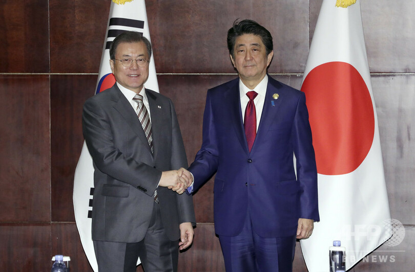 しかし会談後の記者会見で安倍首相は、問題を解決するのは「韓国政府の責任」だと指摘し、日韓関係を健全な関係に戻していくよう、韓国側に求めると述べた。(c)AFP/Jing Xuan TENG