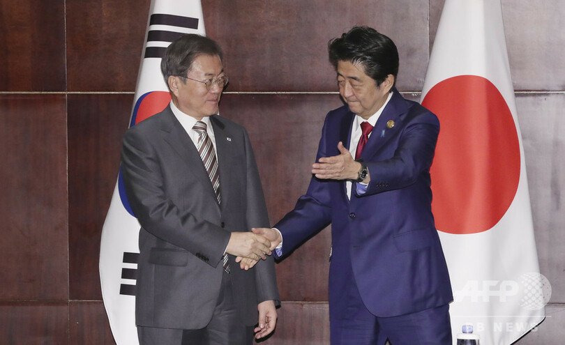 しかし会談後の記者会見で安倍首相は、問題を解決するのは「韓国政府の責任」だと指摘し、日韓関係を健全な関係に戻していくよう、韓国側に求めると述べた。(c)AFP/Jing Xuan TENG