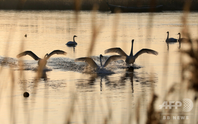 ここで冬を過ごす1万羽を超えるオオハクチョウは優雅に泳ぎながら水と戯れ、翼を大きく広げて冬空を舞う。遠くから眺めると、躍動するオオハクチョウの姿が山々、漁船、ススキと合わさる様子は絵巻のようだ。(c)CNS/JCM/AFPBB News