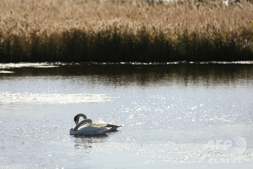 ここで冬を過ごす1万羽を超えるオオハクチョウは優雅に泳ぎながら水と戯れ、翼を大きく広げて冬空を舞う。遠くから眺めると、躍動するオオハクチョウの姿が山々、漁船、ススキと合わさる様子は絵巻のようだ。(c)CNS/JCM/AFPBB News