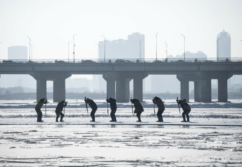 【1月4日 AFP】中国東北部の黒竜江(Heilongjiang)省ハルビン(Harbin)で、凍結した松花江(Songhua river)から、つるはしを使って氷の塊を切り出す作業員ら。切り出し作業は、毎年恒例のハルビン氷祭り(Harbin Ice Festival)用に、手工具と機械を用いて、夜明け前から長時間続けられる。(c)AFP