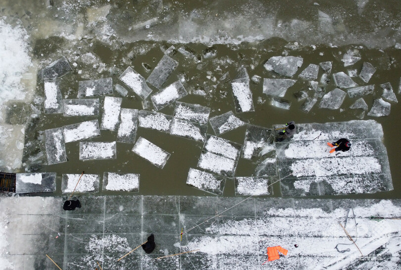 【1月4日 AFP】中国東北部の黒竜江(Heilongjiang)省ハルビン(Harbin)で、凍結した松花江(Songhua river)から、つるはしを使って氷の塊を切り出す作業員ら。切り出し作業は、毎年恒例のハルビン氷祭り(Harbin Ice Festival)用に、手工具と機械を用いて、夜明け前から長時間続けられる。(c)AFP