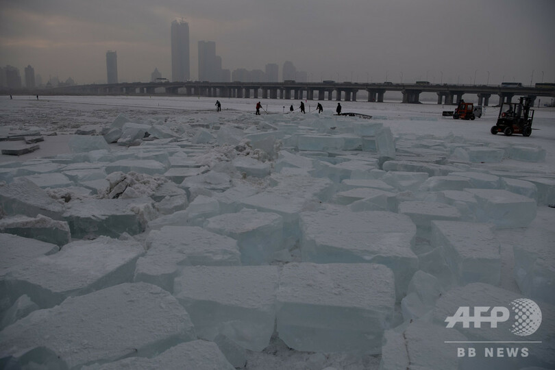【1月4日 AFP】中国東北部の黒竜江(Heilongjiang)省ハルビン(Harbin)で、凍結した松花江(Songhua river)から、つるはしを使って氷の塊を切り出す作業員ら。切り出し作業は、毎年恒例のハルビン氷祭り(Harbin Ice Festival)用に、手工具と機械を用いて、夜明け前から長時間続けられる。(c)AFP