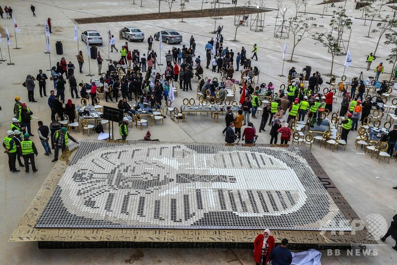 【12月29日 AFP】エジプトの首都カイロ郊外のギザ(Giza)に新設された「大エジプト博物館(Grand Egyptian Museum)」の前に28日、7260杯のコーヒーで描かれた古代エジプトの王(ファラオ)、ツタンカーメン(Tutankhamun)の有名な「黄金のマスク」が登場した。(c)AFP