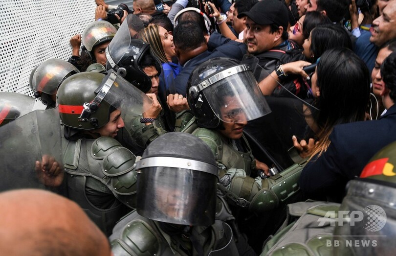 【1月6日 AFP】南米ベネズエラで5日、野党指導者の国会議長フアン・グアイド(Juan Guaido)氏が国民議会への入場を治安要員から阻止され、グアイド氏の政敵が自らを国会議長と宣言した。野党側はこれを「議会クーデター」と非難している。