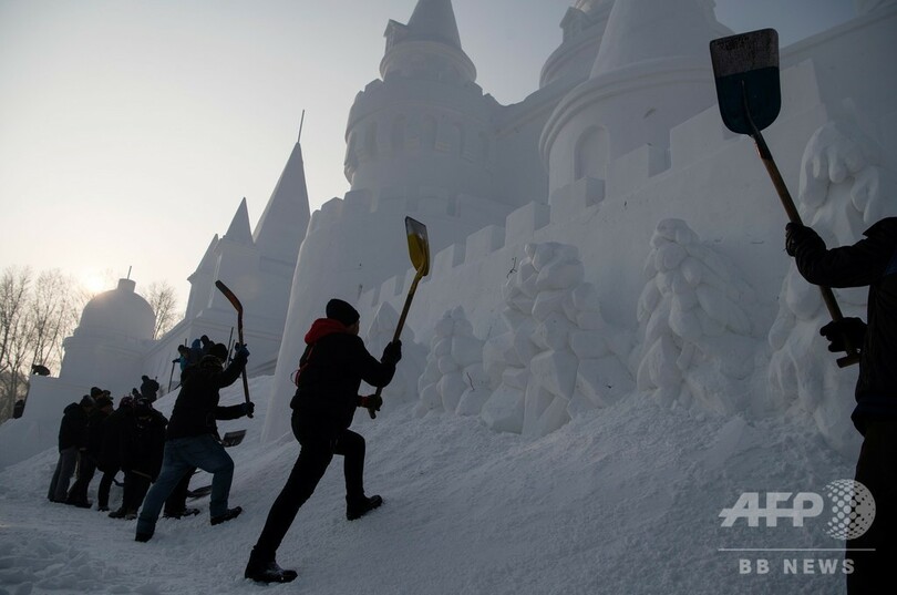 今年の氷雪祭には、17万立方メートルの氷が用いられている。100人超の作業員らが、凍結した松花江から氷の塊を切り出したという。