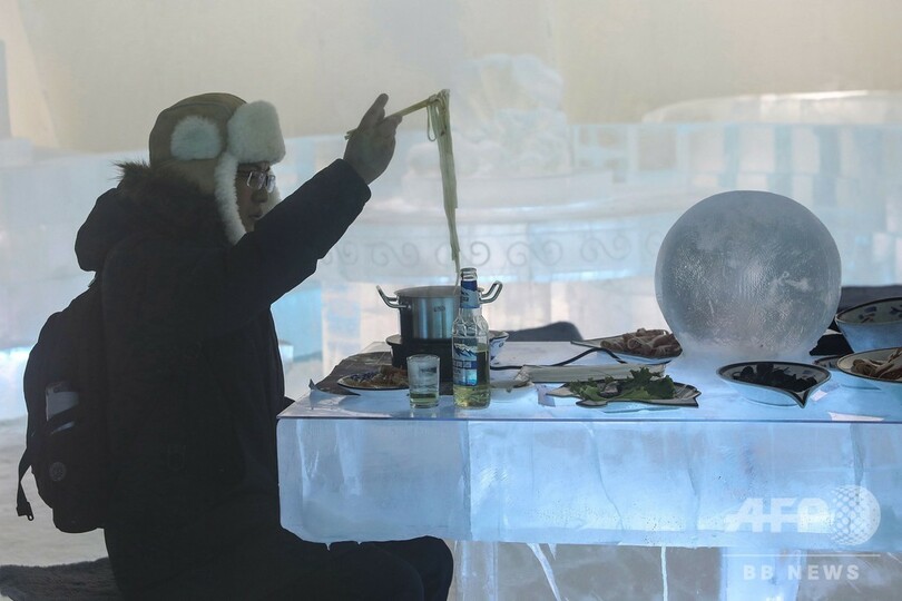 会場には、氷で造られた塔や彫刻作品、雪像が並び、来場者らは、色鮮やかにライトアップされた氷の間を練り歩いた。その他、レースのウエディングドレスにダウンの上着を羽織った花嫁らの姿も。新郎新婦43組が、「氷の中の集団結婚式」に参加するため列をつくった。5日の午後の気温は氷点下7度まで冷え込んだが、松花江(Songhua river)の氷をくりぬいたプールでは寒中水泳大会も行われ、勇気ある参加者らが飛び込んだ。