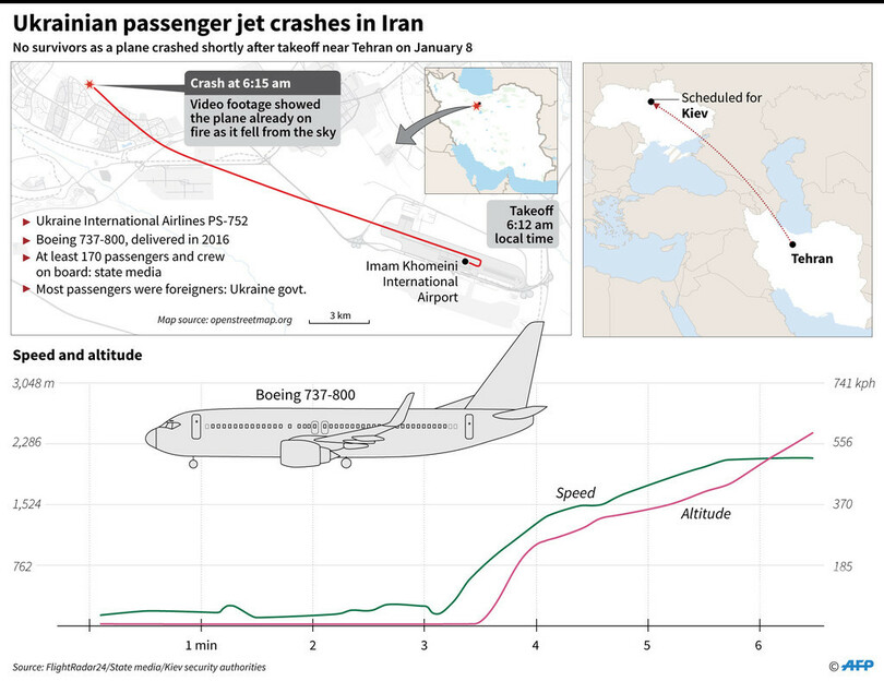 ウクライナ国際航空(Ukraine International Airlines)のボーイング(Boeing)737型機は、テヘランの空港を8日午前6時10分(日本時間同11時40分)に離陸した数分後にレーダーから消え、テヘラン州内に墜落した。