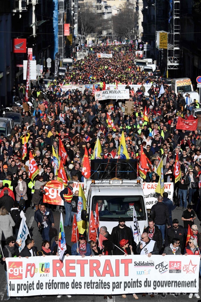 【1月10日 AFP】(更新)フランス各地で9日、年金制度改革に反対する大規模デモが行われ、内務省によると鉄道労働者に加え教師やその他公務員ら、全国で45万2000人が参加した。全国規模のデモは、昨年12月5日に公共交通機関のストが始まってから今回で5回目。ストは36日目を迎えた。