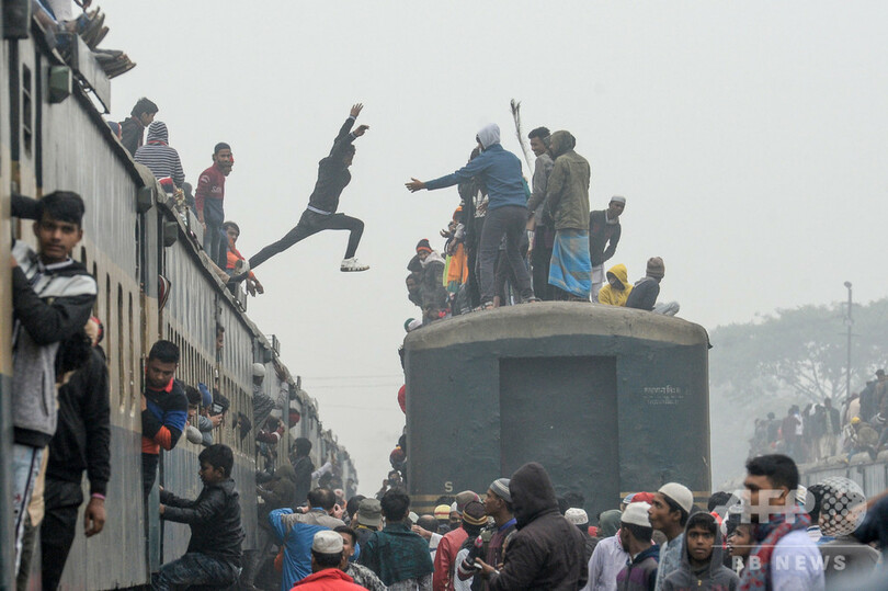 【1月20日 AFP】バングラデシュ・ダッカから北へ約30キロのトンギ(Tongi)で、毎年開催されているイスラム教徒の集会「ビッショ・イジュテマ(Biswa Ijtema)」の最後の祈り「アケリ・ムナジャト(Akheri Munajat)」に参加しようと、列車から列車へ飛び移る信者。(c)AFP