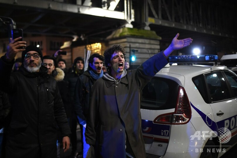 デモ参加者らは、警察やマクロン氏とその年金制度改革を批判するシュプレヒコールを上げた。年金制度改革をめぐっては、国内交通機関が過去数十年で最長となるストライキを実施している。