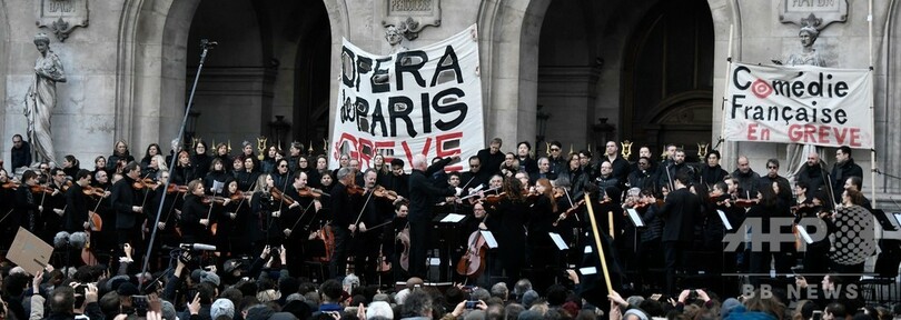 デモ参加者らは、警察やマクロン氏とその年金制度改革を批判するシュプレヒコールを上げた。年金制度改革をめぐっては、国内交通機関が過去数十年で最長となるストライキを実施している。
