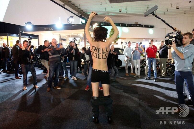 あるグループは、石油大手ロイヤル・ダッチ・シェル(Royal Dutch Shell)の展示ブースで抗議を実施。「シェルは殺し屋」と書かれたプラカードを掲げ、同社のロゴを模した仮面をつけて、ビラを配るなどした。
