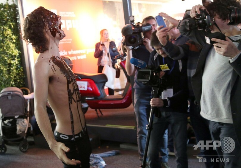 展示車に血!? ベルギーのモーターショーで「絶滅への反逆」が抗議