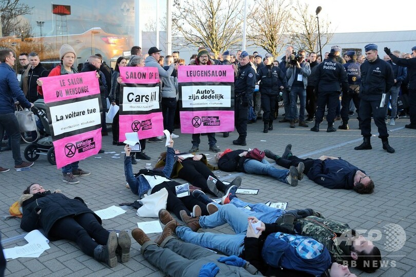 【1月19日 AFP】ベルギー首都ブリュッセルの警察は18日、同市で開催中の「ブリュッセルモーターショー(Brussels Motor Show)」で、気候変動の危機を訴える団体「絶滅への反逆(Extinction Rebellion)」の活動家らが血に見立てた赤い液体を展示車にまき、周囲に横たわって死んだふりなどをしたとして150人近くを逮捕した。