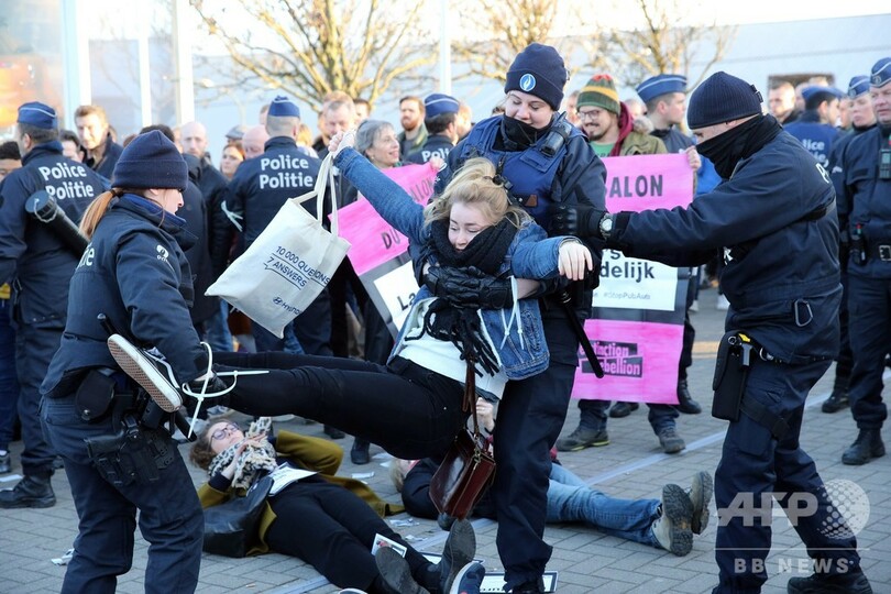 【1月19日 AFP】ベルギー首都ブリュッセルの警察は18日、同市で開催中の「ブリュッセルモーターショー(Brussels Motor Show)」で、気候変動の危機を訴える団体「絶滅への反逆(Extinction Rebellion)」の活動家らが血に見立てた赤い液体を展示車にまき、周囲に横たわって死んだふりなどをしたとして150人近くを逮捕した。