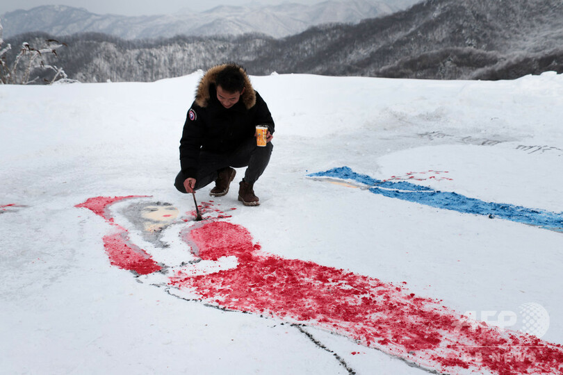【1月23日 CNS】中国・河南省(Henan)洛陽市(Luoyang)の伏牛(Funiu)山スキー場で17日、絵画愛好家が雪をキャンバスに見立てて水墨画風の絵を描いた。