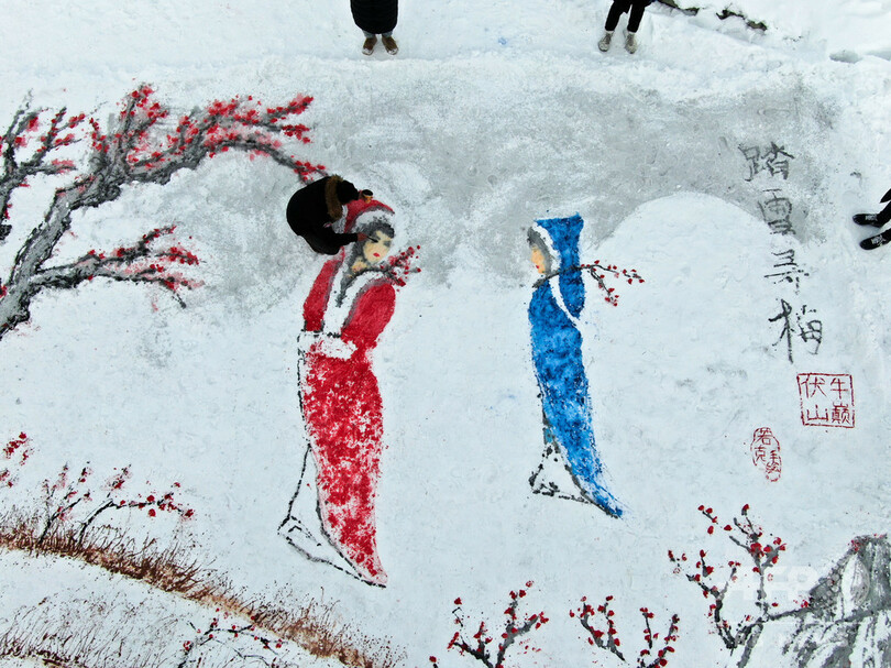 雪のキャンバスに鮮やかに…伝統絵画現る 中国・洛陽市