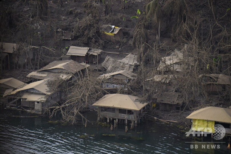 しかし、AFP記者が21日に火山周辺上空を飛行するフィリピン軍のヘリコプターに同乗したところ、火山灰に覆われた家屋の近くには10頭ほどの白い牛がうろつき、湖岸にはカラフルな船が複数停泊していた。