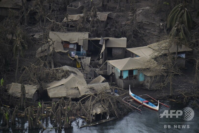しかし、AFP記者が21日に火山周辺上空を飛行するフィリピン軍のヘリコプターに同乗したところ、火山灰に覆われた家屋の近くには10頭ほどの白い牛がうろつき、湖岸にはカラフルな船が複数停泊していた。