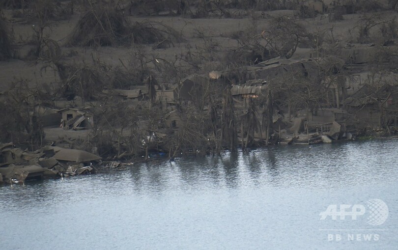 家屋は火山灰に押しつぶされたり埋もれたりしていたが、AFP記者は少なくとも1軒だけ、屋根がきれいに掃かれた家屋を確認した。(c)AFP