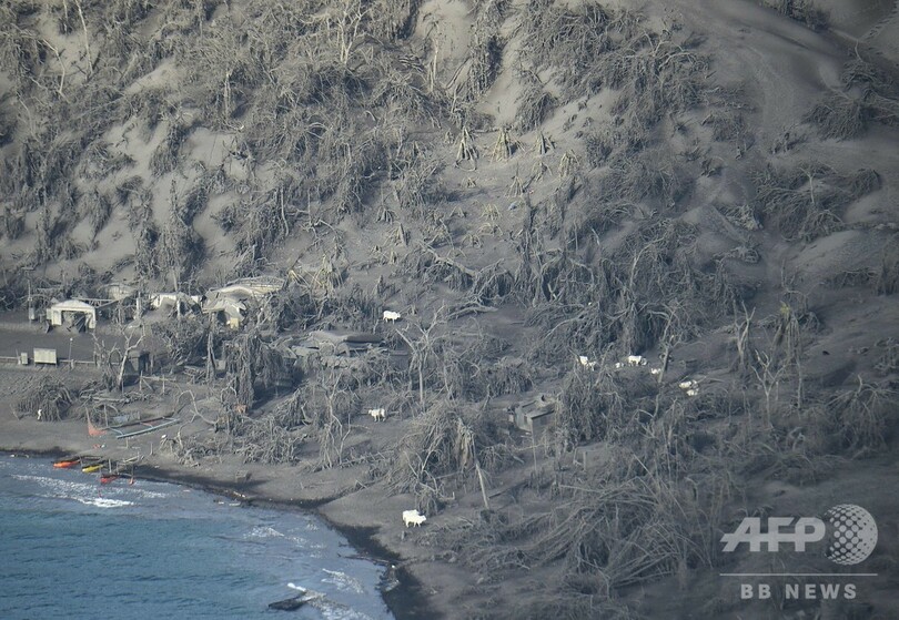 しかし、AFP記者が21日に火山周辺上空を飛行するフィリピン軍のヘリコプターに同乗したところ、火山灰に覆われた家屋の近くには10頭ほどの白い牛がうろつき、湖岸にはカラフルな船が複数停泊していた。