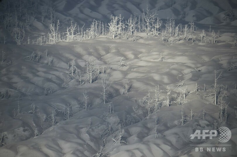 家屋は火山灰に押しつぶされたり埋もれたりしていたが、AFP記者は少なくとも1軒だけ、屋根がきれいに掃かれた家屋を確認した。(c)AFP