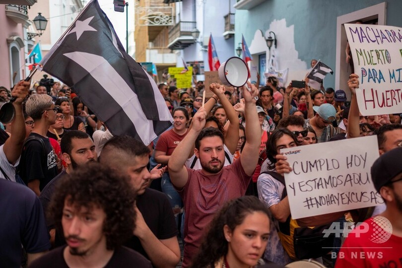 首都サンフアンでは20日、数百人が抗議デモを行い、わずか6か月前に前知事を辞任に追い込んだのと同様、ワンダ・バスケス・ガルセド(Wanda Vazquez Garced)知事の退陣を迫った。(c)AFP
