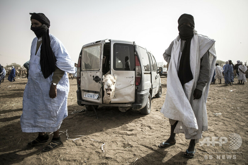 【1月28日 AFP】モーリタニアの首都ヌアクショットで開かれた同市最大のラクダ市で、縛られ車に乗せられるラクダ。肉用や乳用のラクダは、1頭あたり550ユーロ(約6万7000円)前後で売られる。乳からはチーズやヨーグルトが作られる。(c)AFP