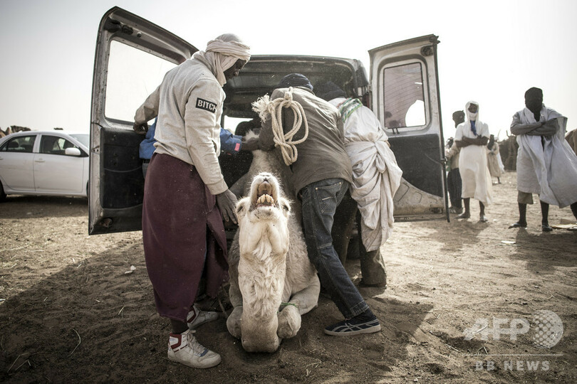 【1月28日 AFP】モーリタニアの首都ヌアクショットで開かれた同市最大のラクダ市で、縛られ車に乗せられるラクダ。肉用や乳用のラクダは、1頭あたり550ユーロ(約6万7000円)前後で売られる。乳からはチーズやヨーグルトが作られる。(c)AFP