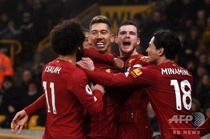【1月24日 AFP】19-20イングランド・プレミアリーグは23日、第24節の試合が行われ、リバプール(Liverpool FC)はロベルト・フィルミーノ(Roberto Firmino)が終盤に決勝ゴールを挙げ、アウェーでウォルバーハンプトン・ワンダラーズ(Wolverhampton Wanderers)を2-1で下した。南野拓実(Takumi Minamino)がリーグ戦デビューを飾ったリバプールは、2位マンチェスター・シティ(Manchester City)との勝ち点差を再び16に広げている。