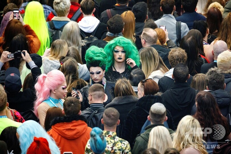 ドラァグクイーンとして活躍する米国人タレント、ルポール(RuPaul)の名を冠した同イベントは、ロンドンのほか米ロサンゼルスでも開かれ、多くのドラァグクイーンらが集まる。(c)AFP