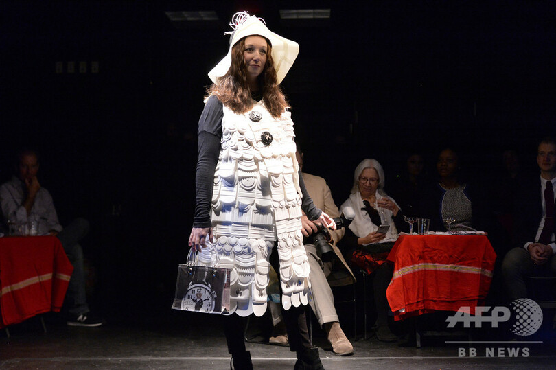 【1月28日 AFP】米マサチューセッツ州リン(Lynn)にあるギャラリー「ギャラリーズ・アット・リン・アート(Galleries at Lynn Arts)」でこのほど、廃棄物を素材として利用したファッションショー「Rubbish to Runway(『ごみからランウェイに』の意)」が開催され、レジ袋や梱包(こんぽう)材、革の切れ端、プラスチックのフォークやスプーン、新聞のマイクロフィルム、瓶のふた、見取り図の紙などを用いたドレスや上着が披露された。
