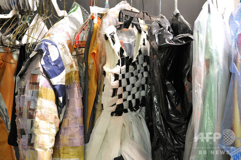 【1月28日 AFP】米マサチューセッツ州リン(Lynn)にあるギャラリー「ギャラリーズ・アット・リン・アート(Galleries at Lynn Arts)」でこのほど、廃棄物を素材として利用したファッションショー「Rubbish to Runway(『ごみからランウェイに』の意)」が開催され、レジ袋や梱包(こんぽう)材、革の切れ端、プラスチックのフォークやスプーン、新聞のマイクロフィルム、瓶のふた、見取り図の紙などを用いたドレスや上着が披露された。