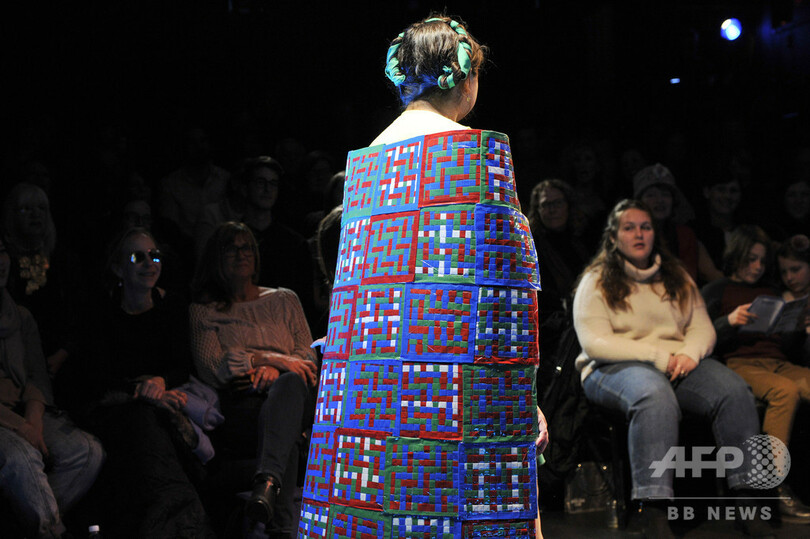 【1月28日 AFP】米マサチューセッツ州リン(Lynn)にあるギャラリー「ギャラリーズ・アット・リン・アート(Galleries at Lynn Arts)」でこのほど、廃棄物を素材として利用したファッションショー「Rubbish to Runway(『ごみからランウェイに』の意)」が開催され、レジ袋や梱包(こんぽう)材、革の切れ端、プラスチックのフォークやスプーン、新聞のマイクロフィルム、瓶のふた、見取り図の紙などを用いたドレスや上着が披露された。