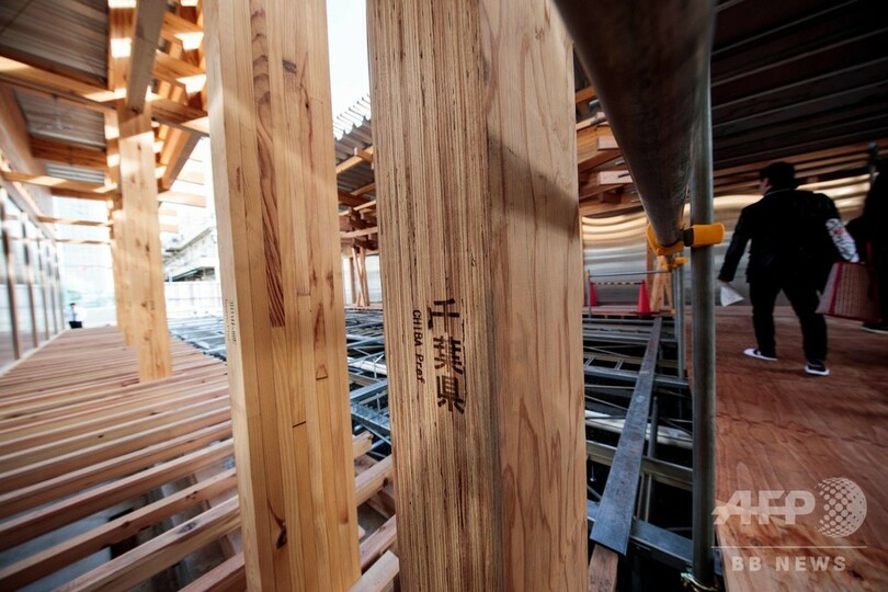 これらの木材は63の自治体から提供されたもので、施設は大会後に解体され、各自治体に返却し再利用してもらう。組織委は、持続可能性に配慮した五輪というテーマの一環と説明している。(c)AFP