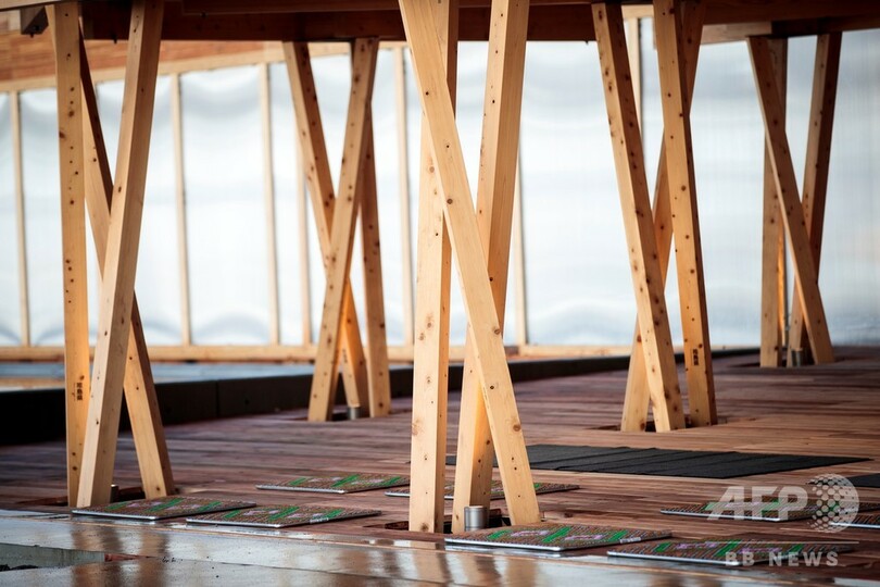 これらの木材は63の自治体から提供されたもので、施設は大会後に解体され、各自治体に返却し再利用してもらう。組織委は、持続可能性に配慮した五輪というテーマの一環と説明している。(c)AFP