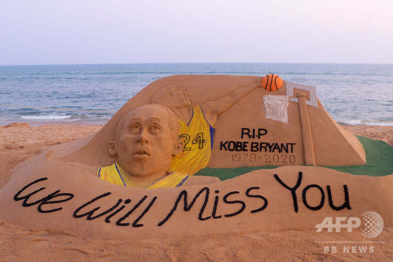 インド人アーティストのスデルサン・パトナイク(Sudarsan Pattnaik)氏による像には、「あなたがいなくてさびしい」とメッセージが添えられている。バスケ界のスーパースター、ブライアント氏と10代の娘の墜落事故による訃報は、世界のスポーツ界や芸能界で深い悲しみが広がっている。(c)AFP